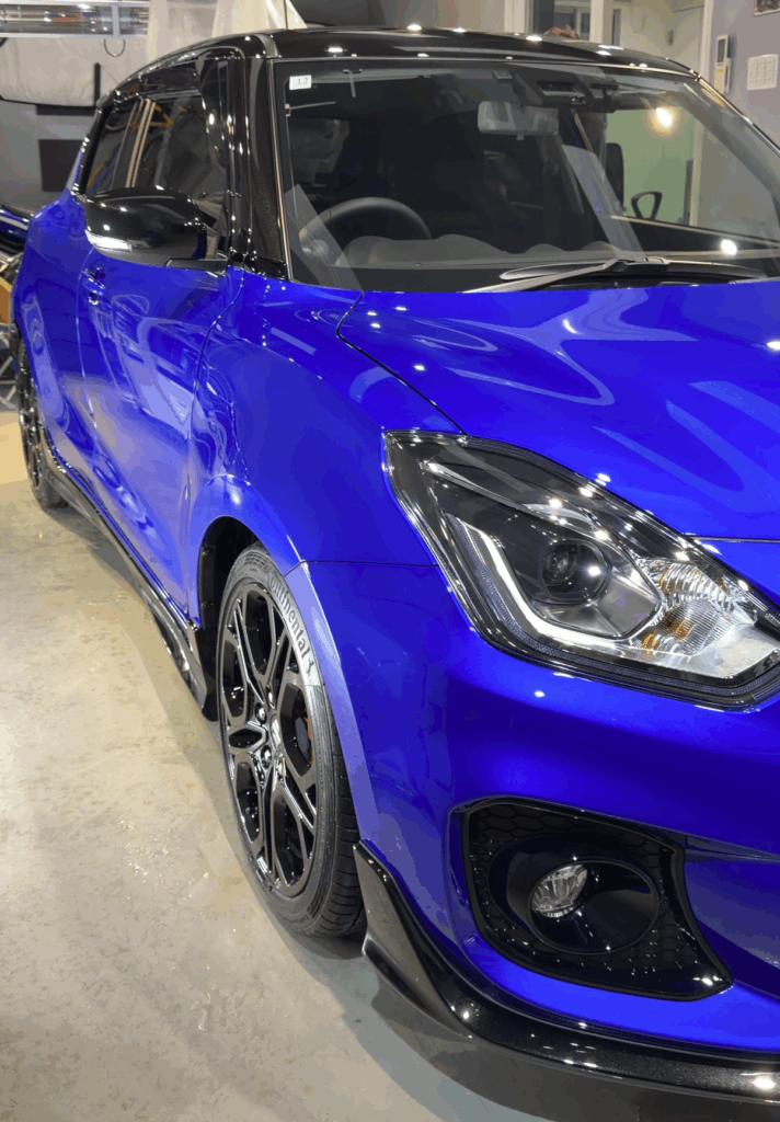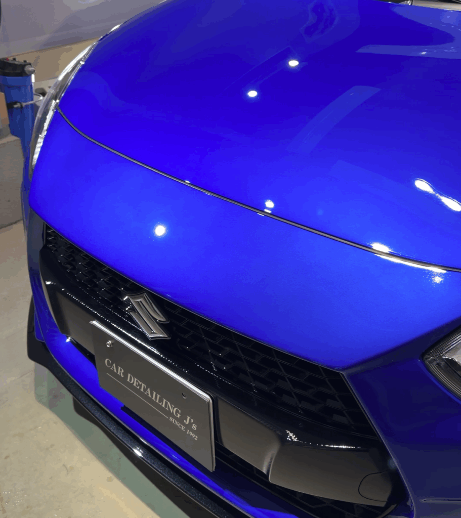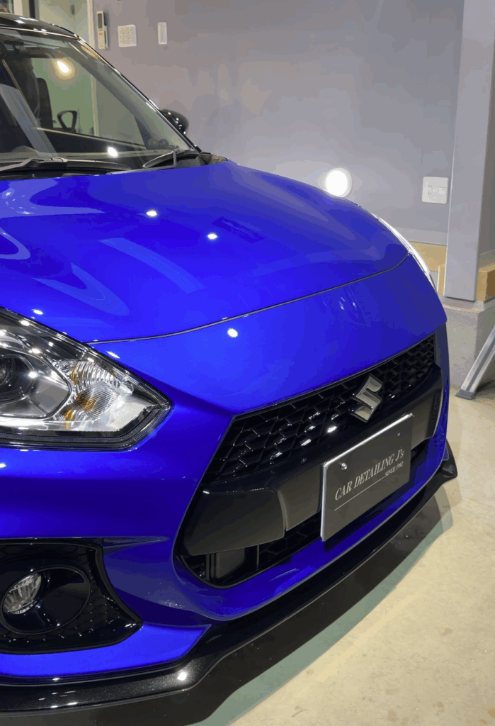 本日は新車でご納車された新車スイフトスポーツ(青色)にホームページに記載ある、5年耐久のコーティング施工を行います。